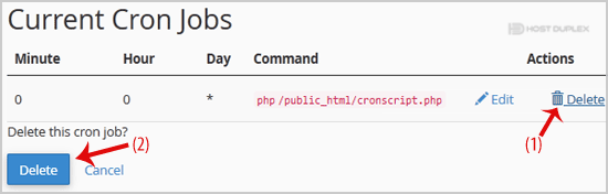 1. Under Current Cron Jobs, locate your cronjob and then click on Delete button.