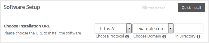 - Choose Installation URL: Choose the appropriate protocol/domain. Inside the “In Directory” field, should you want to install this in a directory, i.e. example.com/directory, enter the directory name. Otherwise, leave it blank to install in your main domain, i.e. example.com
