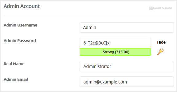 - Admin Username: Your new e107 username (for security reason do not use the Administrator or the Admin username.)