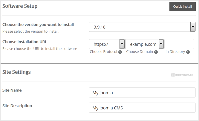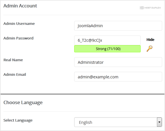 - Admin Username: Your new Joomla username (for security reason do not use the Administrator or the Admin username.)