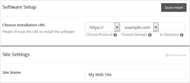 - Choose Installation URL: Choose the appropriate protocol/domain. Inside the “In Directory” field, should you want to install this in a directory, i.e. example.com/directory, enter the directory name. Otherwise, leave it blank to install in your main domain, i.e. example.com