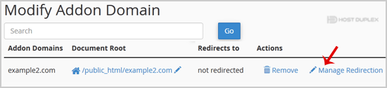 3. Under Modify Addon Domain, locate the add-on domain and click on Manage Redirection.
