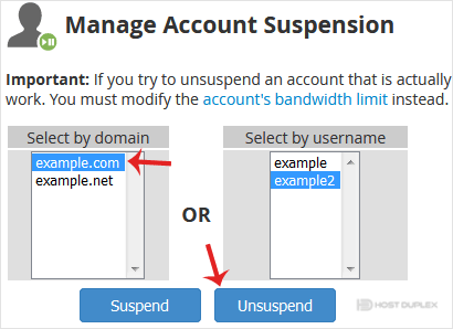 3. Under Select by Domain, choose the user you wish to unsuspend or if you know only the username, select the user under Select by User from the dropdown list. If the user is displayed in red color, it means he is suspended. Alternatively, if he is not displayed in red, then he is already unsuspended, and you don’t need to take an action.